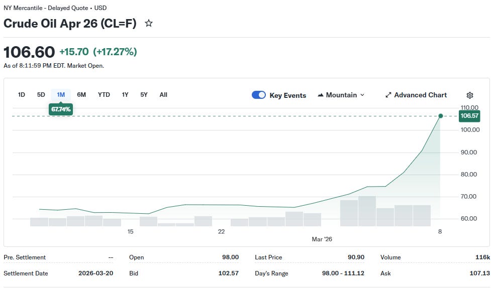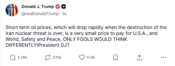 La teoría de Trump parece ser que el precio del crudo se está disparando porque Irán estaba fabricando armas nucleares y que cuando se confirme su destrucción, el precio bajará de nuevo. La subida actual es un coste menor, merluzos.