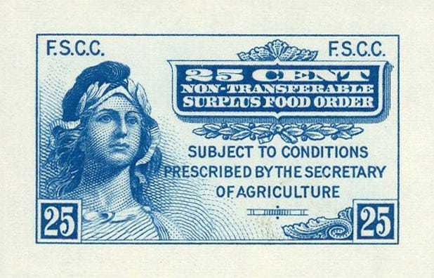 Cuando fueron creados, en 1939, los cupones de alimentos (food stamps) tenían una doble función. Por un lado, eran un programa de asistencia directa a familias pobres, con dificultades para comprar comida. Por otro, servía como un sistema para resolver el problema de exceso de producción agrícola en el país, fruto del proteccionismo creciente fuera y la persistente falta de demanda interna. Esto explica el curioso hecho de que un programa de asistencia a los pobres esté en manos del departamento de agricultura, no servicios sociales.