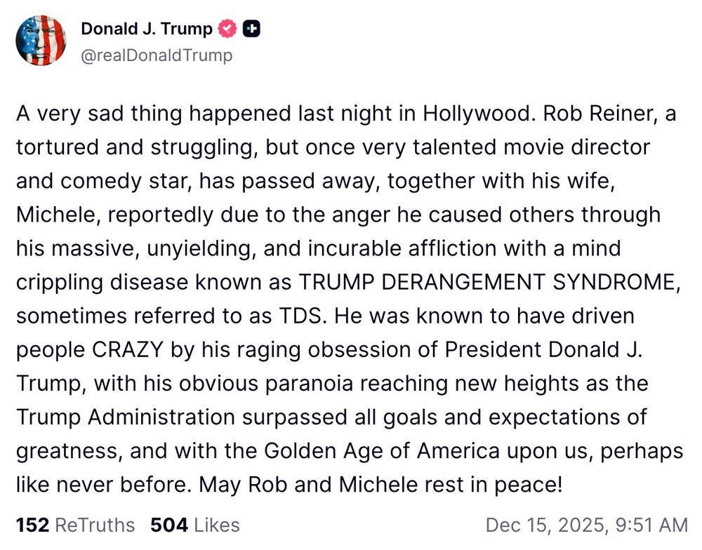 “Algo muy triste sucedió anoche en Hollywood. Rob Reiner, un hombre torturado en horas bajas, que fue en su día un director de cine y comediante con mucho talento, ha muerto junto con su mujer Michele, según dicen debido al enfado que ha provocado en otros debido a su enorme, implacable e incurable dolencia con una enfermedad que destruye mentes conocida como SÍNDROME DE DEMENCIA TRUMPIANA, a veces conocida como TDS. Se conoce que había vuelto a gente LOCA debido a su desaforada obsesión con el presidente Donald J. Trump, con su obvia paranoia llegando a nuevos límites cuando la administración Trump ha sobrepasado todos los objetivos y expectativas de grandeza, y con una nueva era dorada de América ante nosotros, quizás como nunca antes. ¡Espero que Rob y Michele descansen en paz!”