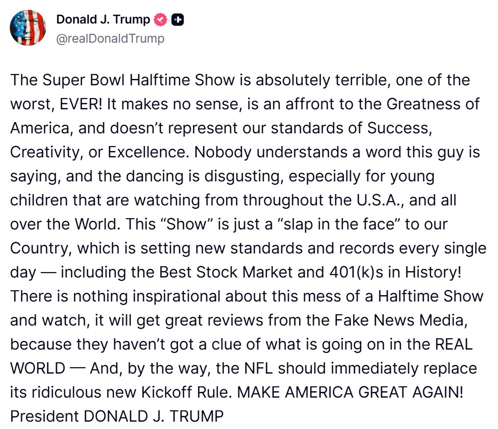 “El espectáculo en la media parte de la Superbowl fue absolutamente terrible, uno de los peores de todos los tiempos. No tiene sentido, es una afrenta a la grandeza de América y no representa nuestros estándares de éxito, creatividad o excelencia. Nadie entiende una palabra de lo que dice ese tipo, y el baile es asqueroso, especialmente para los niños jóvenes que están viéndolo por todos Estados Unidos y el mundo entero. Este “espectáculo” es una “bofetada en la cara” a nuestro país, que está marcando nuevos estándares y récords cada día - incluyendo las mejores cotizaciones de bolsa y cuentas de jubilación subvencionadas de la historia. No hay nada que inspire de este desastre de espectáculo de media parte y contemplad, seguro que tendrá grandes críticas en los medios de comunicación falso, porque no tienen ni idea de lo que pasa en el mundo real - y por cierto, la NFL tiene que cambiar la ridícula regla nueva de saque de centro. Haced América grande de nuevo. Presidente Donald J. Trump.”