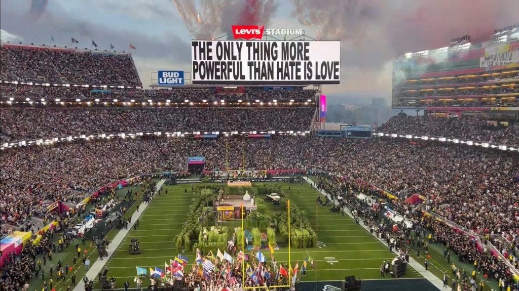 El sector rápidamente soliviantado de la derecha americana se indignó con la furia de mil soles de inmediato. El frenesí fue tal que Turning Point USA, la organización del malogrado Charlie Kirk, decidió montar un espectáculo alternativo con artistas americanos de verdad, como Kid Rock, Brantley Gilbert, Gabby Barrett y Lee Brice1. Gran parte de los influencers MAGA poco menos que declararon una fatwa contra la NFL, que es un poco como declararse en contra el Mundial de Fútbol en Brasil o España.