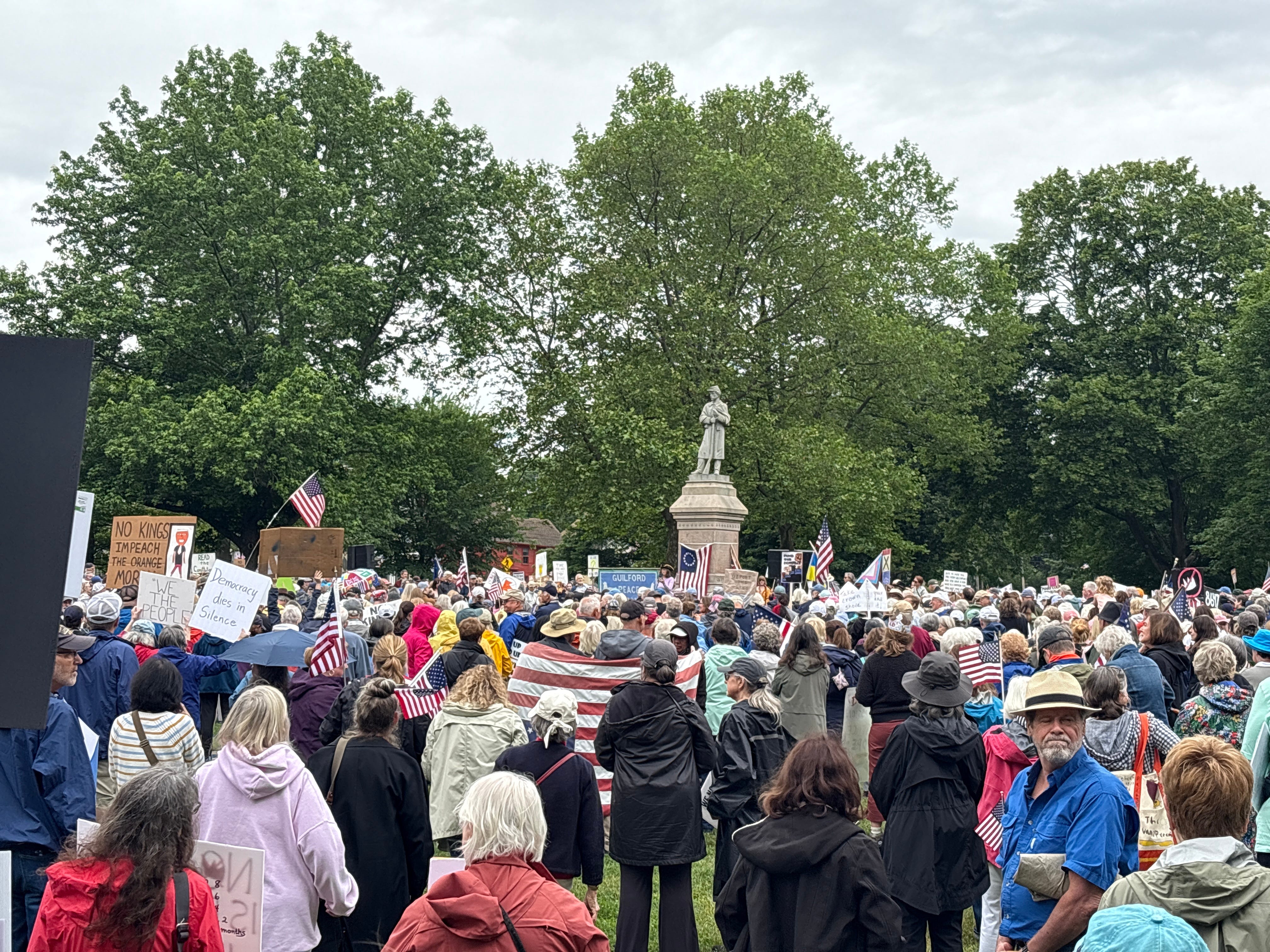 A las once de la mañana de un lluvioso día de junio, una multitud de algo más de un millar de personas se concentraba en el Town Green, a los pies de una estatua a los soldados de la Unión durante la guerra civil. El motivo era una de las más de 2.000 manifestaciones contra Donald Trump convocadas en pueblos y ciudades de todo el país bajo el lema de “No King” (no rey).