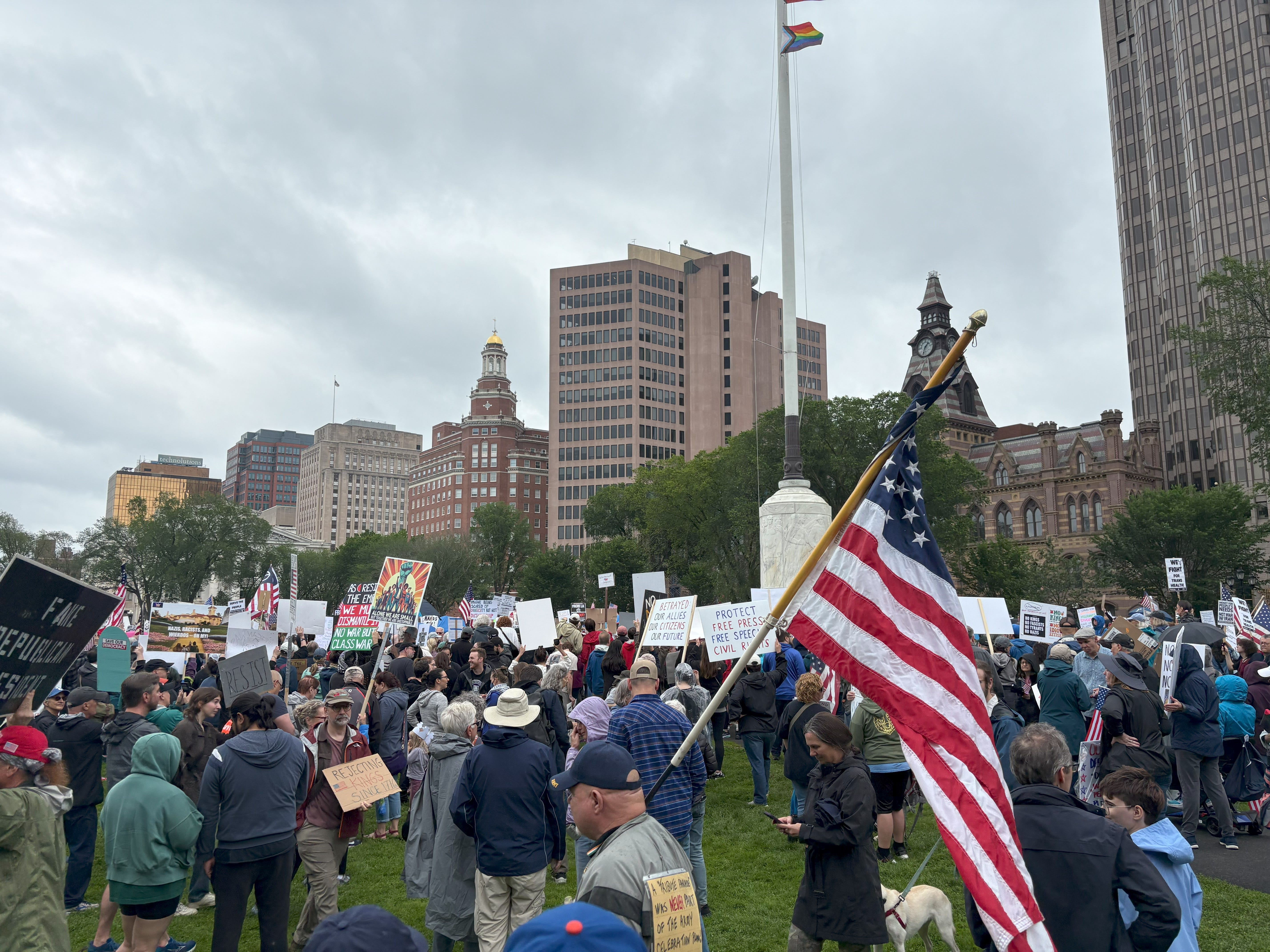 New Haven es una ciudad relativamente pequeña (135.0004), así que la manifestación era considerablemente más grande. A ojo, diría que había varios miles de personas, aunque es difícil decirlo sin imágenes aéreas. La multitud era bastante más diversa; es el área metropolitana más parecida a la media del país demográficamente. Fue una concentración festiva, en la que los organizadores subestimaron la megafonía necesaria y nadie escuchó los discursos. Estuve un rato paseando y charlando con conocidos (incluyendo un par de representantes estatales bastante inquietos) hasta la hora de comer.