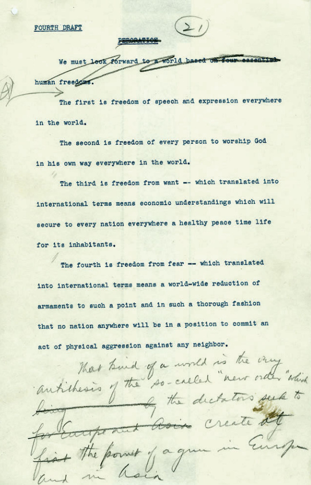 Ver todos los borradores para varios de los discursos más famosos de la historia del país me encantó, no voy a negarlo. El discurso de arriba, el de las “Four Freedoms”, es por supuesto, mi favorito. Como alguien que escribe para políticos estos días, saber que la idea central de las cuatro libertades no aparece hasta el cuarto borrador me tranquiliza mucho.