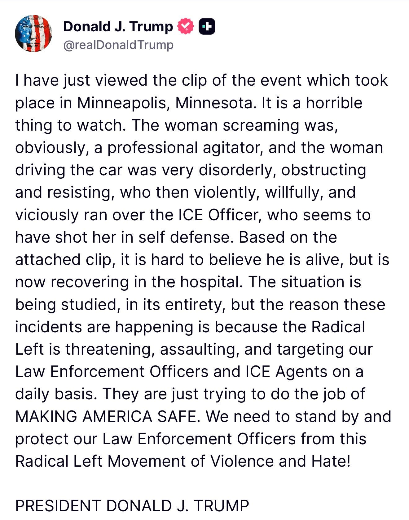 “Acabo de ver el video del evento que ha tenido lugar en Minneapolis, Minnesota. Es algo horrible de ver. La mujer que gritaba era obviamente una agitadora profesional, y la mujer que conducía estaba alterada, obstruyendo, resistiendo, cuando de forma violenta, premeditada y viciosa atropelló al agente de ICE, que parece haber disparado en defensa propia. Viendo el video, es difícil creer que esté vivo, pero está recuperándose en el hospital. La situación está siendo estudiada al completo, pero la razón que estos incidentes tienen lugar es porque la izquierda radical está amenazando, agrediendo, y haciendo a ICE y cuerpos de seguridad su objetivo de forma diaria. Están intentado hacer su trabajo de hacer América segura. Tenemos que respaldar y proteger a los agentes de la ley de este movimiento de izquierda radical de odio y violencia”.